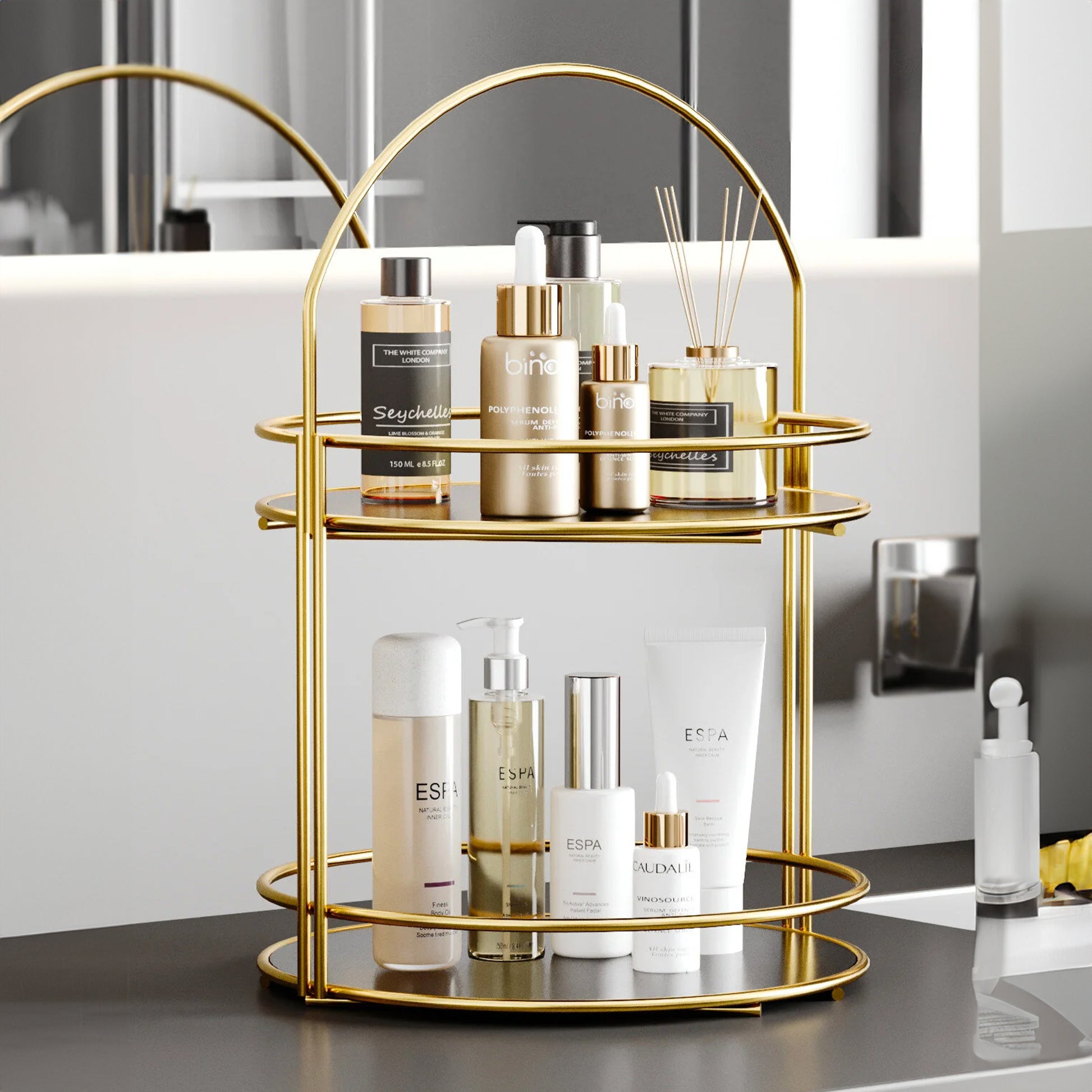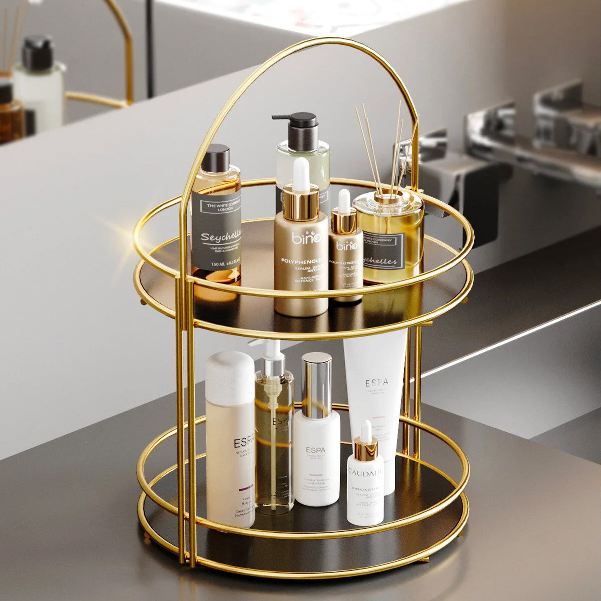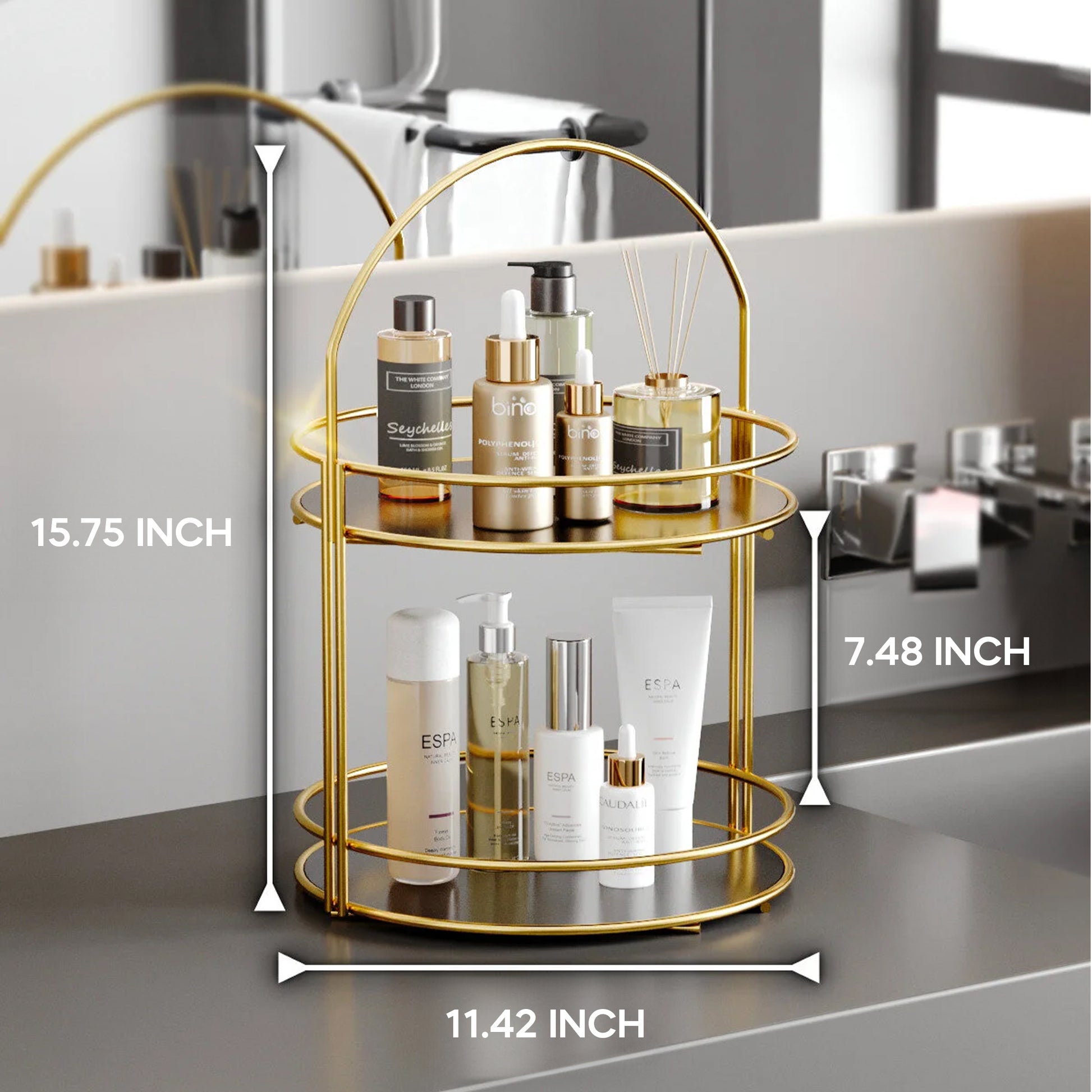 Its sleek gold metal frame brings a modern glam touch while maximizing vertical storage without taking up extra counter space. Perfect for bathrooms, vanities, dressers, or beauty stations.